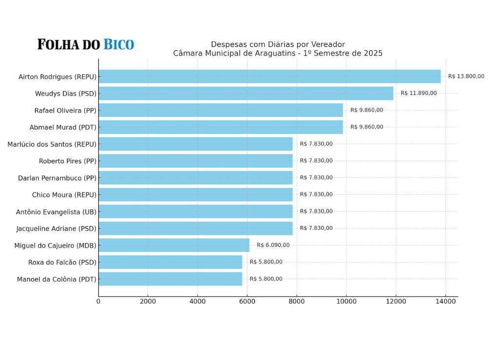A Câmara Municipal de Araguatins desembolsou R$ 110.080,00 em diárias para os vereadores entre fevereiro e maio de 2025. O valor cobre despesas relacionadas a viagens para eventos institucionais, encontros com autoridades e participação em capacitações. O presidente da Casa, vereador Airton Rodrigues (Republicanos), lidera o ranking de gastos, com um total de R$ 13.800,00 no período.