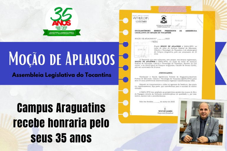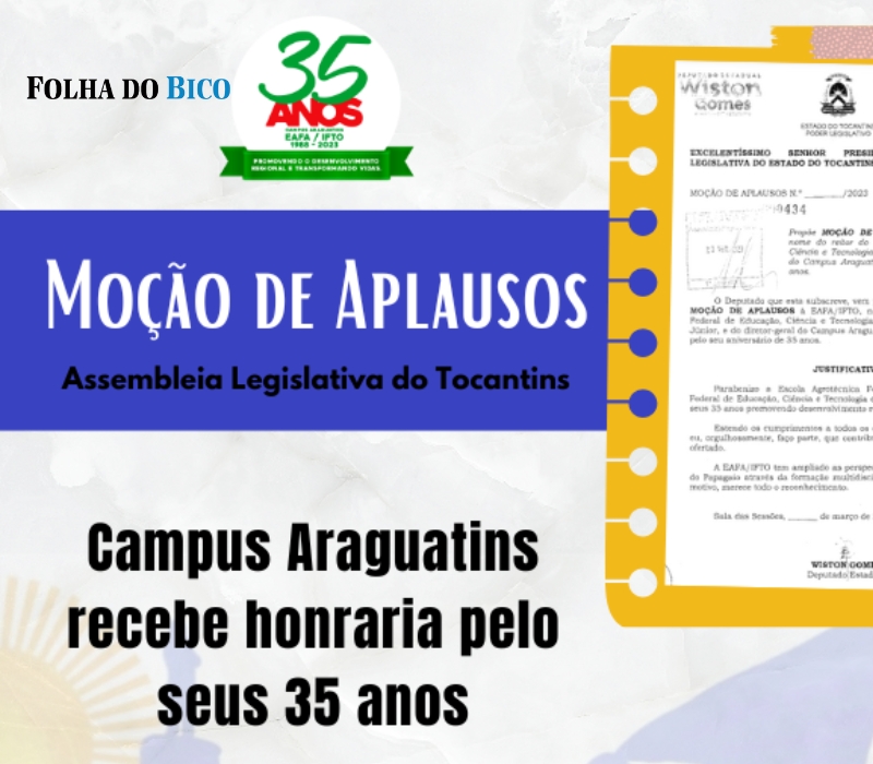 A comemoração pelos 35 anos do atual Campus de Araguatins do Instituto Federal do Tocantins (IFTO), antiga Escola Agrotécnica Federal de Araguatins (Eafa), foi marcada por um importante momento na Assembleia Legislativa do Tocantins. É que o campus recebeu Moção de Aplausos pelo trabalho realizado ao longo desses anos na região que tanto contribui para o desenvolvimento dos municípios do Bico do Papagaio e de Estados vizinhos, como das pessoas daquela localidade.