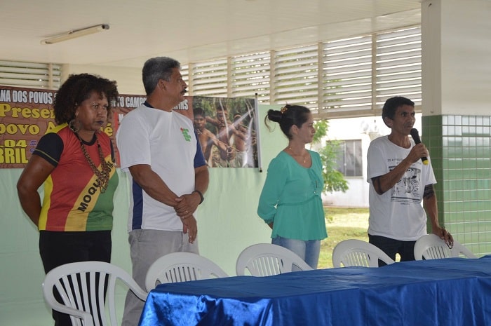Fizeram parte da mesa de honra do encerramento: o coordenador de extensão do Campus Araguatins, Miguel Camargo, a coordenadora do evento e professora do Campus Araguatins, Cássia Maria de Sousa, liderança da aldeia Apinajé, Antônio Veríssimo Apinajé e a pedagoga do Quilombo Ilha de São Vicente, Maria de Fátima Batista Barros.