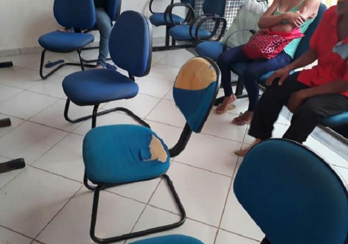 Não bastasse isso, as cadeiras estão com os braços danificados, só no ferro, e algumas espumas do assento expostas. A televisão, que seria o único entretenimento para quem fica por horas à espera do atendimento, também não funciona.