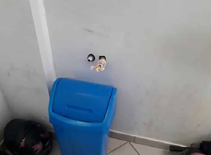 Galões de água: os galões foram colocados no corredor temporariamente, até a finalização da limpeza de uma sala. Depois foram retirados.