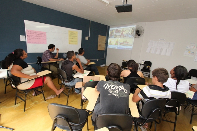 A aula anterior começou com uma atividade de desenho livre acompanhada de uma narrativa, seguido da explanação do professor sobre a história em quadrinhos no Brasil, além de demonstrações por meio de vídeos e slides de tirinhas e tabloides.