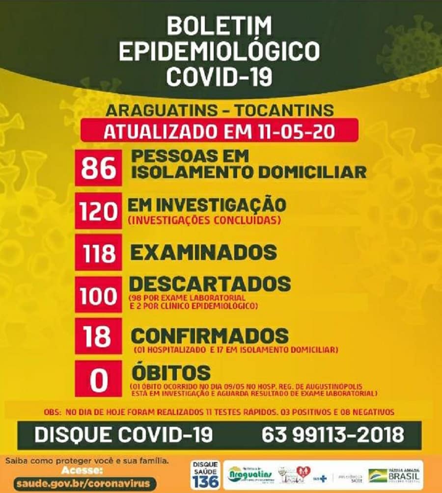 O 47º boletim apresenta-se com 86 (oitenta e seis) pessoas em isolamento domiciliar; 120 (cento e vinte) investigados (investigações concluídas); 118 (cento e dezoito) examinados; 100 (cem) descartados destes, 98 foram descartados por exame laboratorial, e 2 descartados por critério clínico epidemiológico; 18 (dezoito) casos confirmados; 0 (zero) óbito relacionado ao Novo Coronavírus. (1 óbito ocorrido no último sábado, 09/05, no Hospital Regional de Augustinópolis está em investigação e aguarda resultado de exame laboratorial).