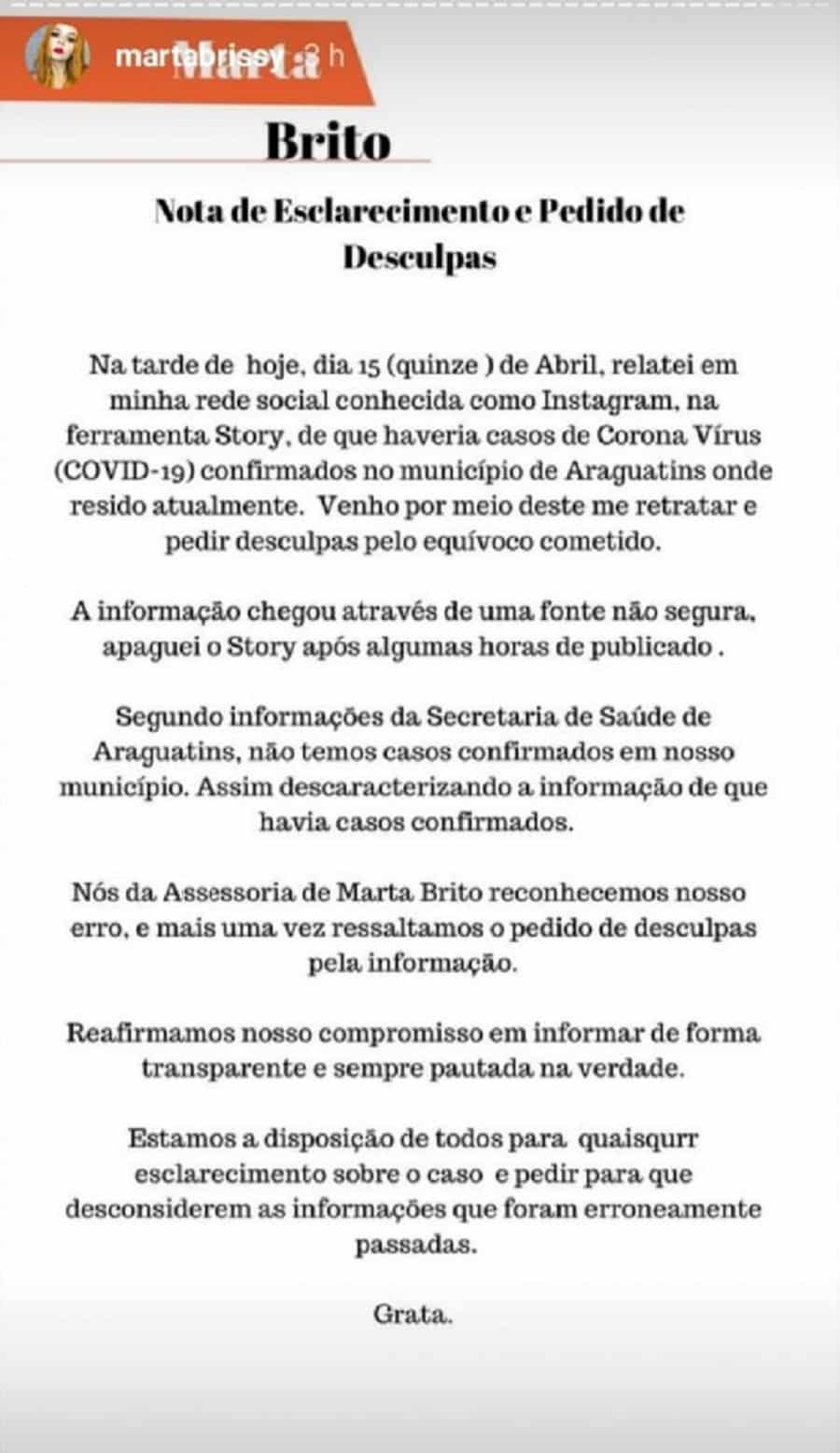 Em seu Instagram, nesta quarta-feira, 15, Marta Brito publicou uma nota de esclarecimento reconhecendo o erro e pedindo desculpas por ter divulgado informações inverídicas que ela considerou como “equívoco vindo de uma fonte não segura”.