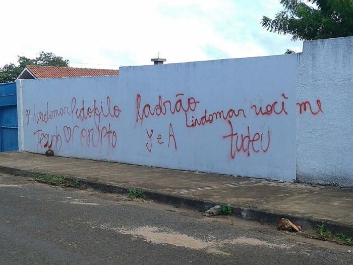 Os vândalos voltaram a atacar na madrugada desta terça-feira, 10. Desta vez o alvo foi o muro do Centro de Ensino Médio Professora Antonina Milhomem. Novamente as ofensiva teve como alvo o prefeito do município, Lindomar Madalena (PSB).