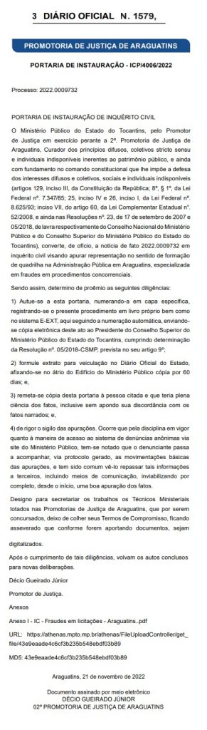 Foi aberto no Ministério Público um Inquérito Civil visando apurar a suposta formação de quadrilha na Administração Pública em Araguatins, especializada em fraudes em procedimentos concorrenciais.