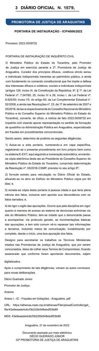 Foi aberto no Ministério Público um Inquérito Civil visando apurar a suposta formação de quadrilha na Administração Pública em Araguatins, especializada em fraudes em procedimentos concorrenciais.