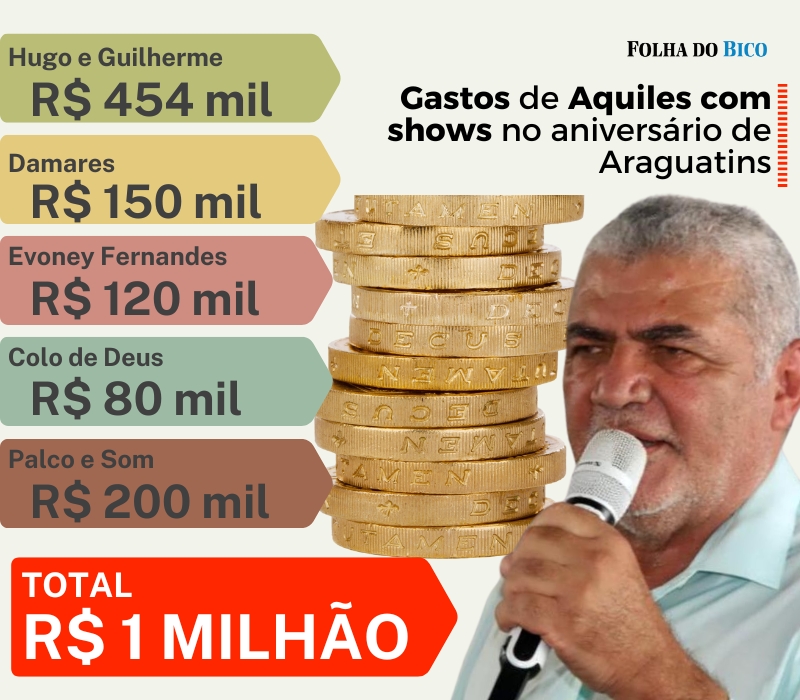 Novos dados no site da Prefeitura Municipal mostram que os gastos com shows no aniversário de Araguatins chegaram a R$ 1 milhão, somente com cachês de artistas e estrutura de palco e som. Esses valores não incluem outras despesas como segurança, organização, mobilização, diárias, deslocamentos, etc, ou seja, os valores são ainda maiores.