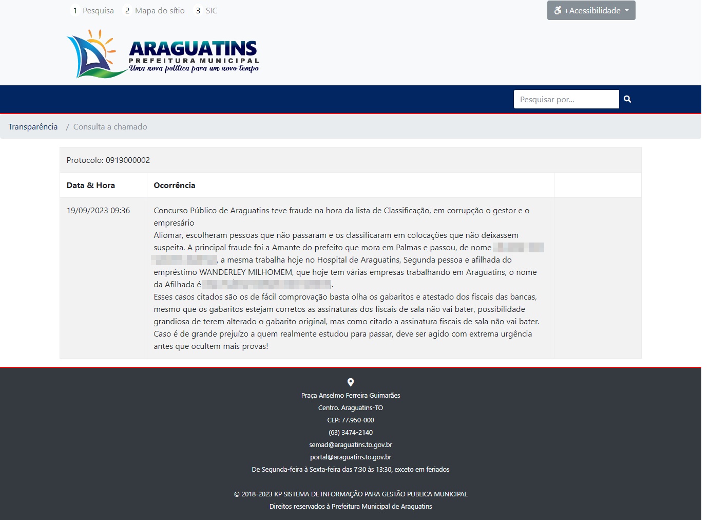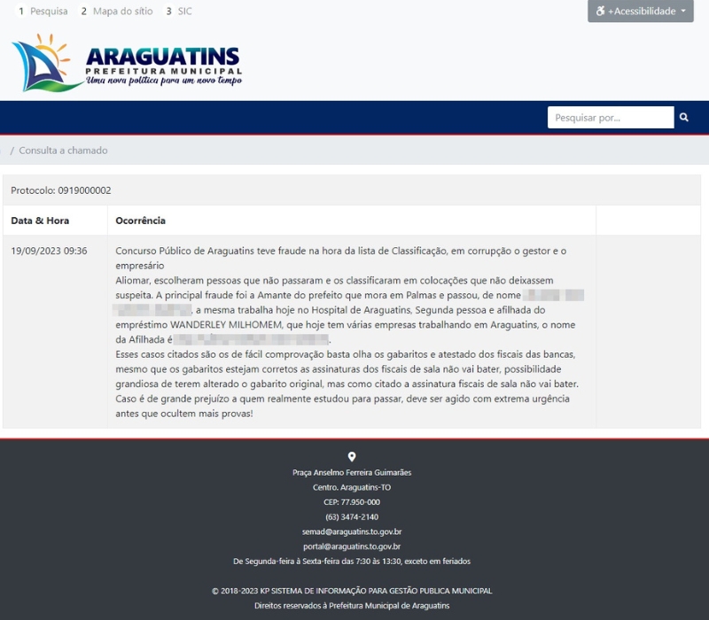 ARAGUATINS: Ocorrência aberta no Portal da Transparência, acusa Aquiles e empresários de suposta fraude em concurso