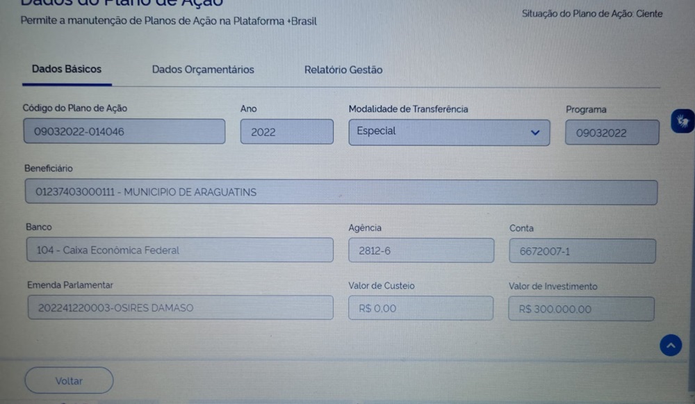 O presidente da Câmara Municipal de Araguatins, Miguel do Cajueiro (UB), solicitou informações detalhadas sobre o uso de uma emenda parlamentar no valor de R$ 300 mil. A emenda, destinada pelo ex-deputado Osires Damaso, a pedido de Cajueiro, foi transferida para a conta do município na Caixa Econômica Federal em 1º de julho de 2022, segundo o ofício protocolado pelo parlamentar.