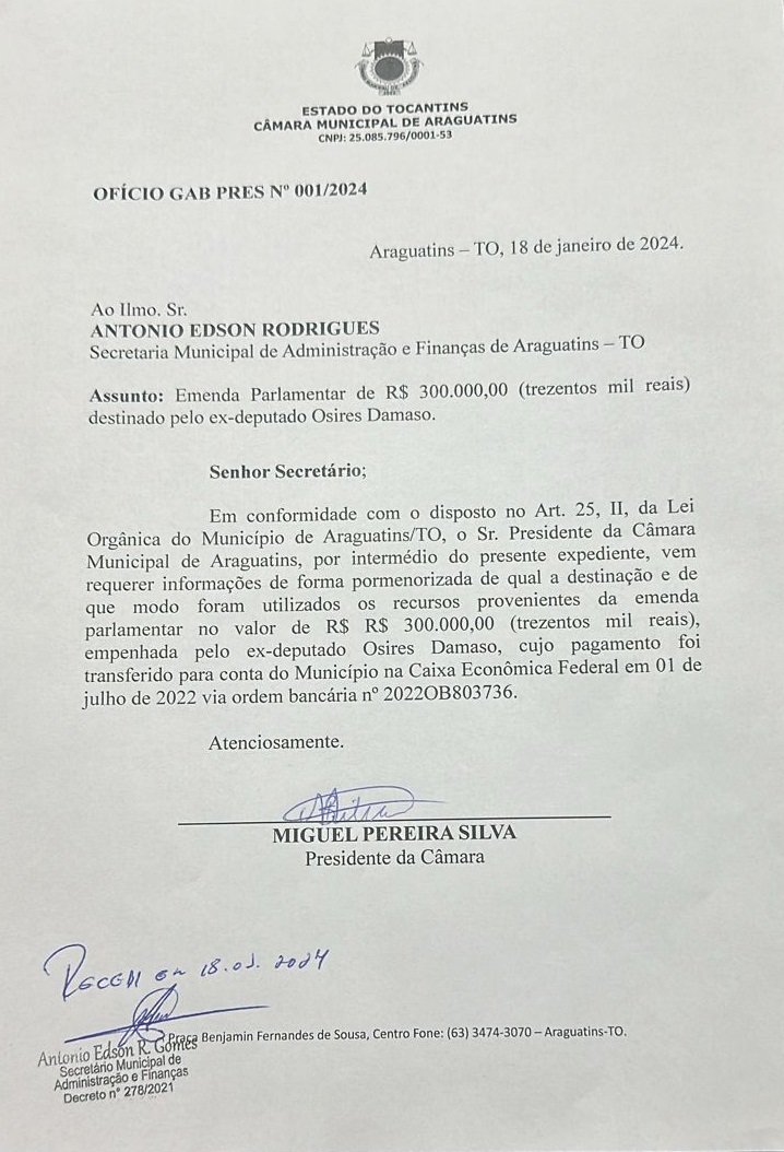 O presidente da Câmara Municipal de Araguatins, Miguel do Cajueiro (UB), solicitou informações detalhadas sobre o uso de uma emenda parlamentar no valor de R$ 300 mil. A emenda, destinada pelo ex-deputado Osires Damaso, a pedido de Cajueiro, foi transferida para a conta do município na Caixa Econômica Federal em 1º de julho de 2022, segundo o ofício protocolado pelo parlamentar.