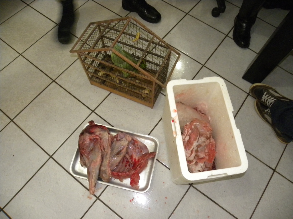 Thiago se encontrava como passageiro do ônibus da empresa Transbrasiliana, da linha Marabá-PA à Imperatriz-MA. Thiago vinha da cidade de Xinguara-PA com destino à cidade de Imperatriz. A abordagem iniciou com a descida de todos os passageiros do interior do ônibus. No bagageiro do veículo a PM encontrou uma caixa de isopor 17 litros contendo várias frações de carne de animal silvestre da espécie caititu, cerca de 4 quilos de carne. No interior do ônibus a PM localizou uma gaiola com um papagaio.