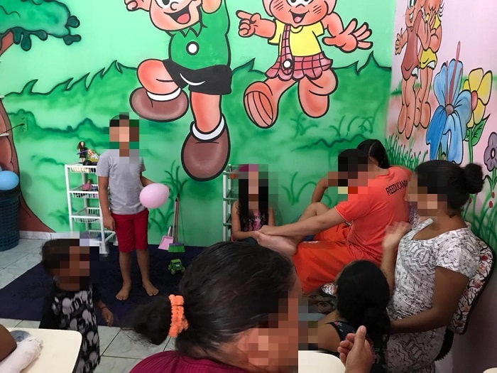 Num dos espaços da cadeia foi realizada pintura das paredes de forma temática no intuito de tornar o ambiente mais agradável, também foram colocados à disposição das crianças brinquedos e jogos.