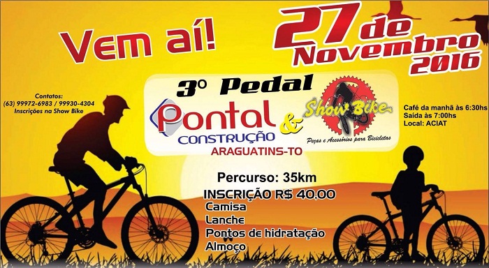 Neste domingo, 27, acontece o “3ª Pedal Pontal Construção e Show Bike”. Os participantes sairão da sede da Associação Comercial e Industrial de Araguatins (Aciat), às 7h, e farão o percurso de 35 km,