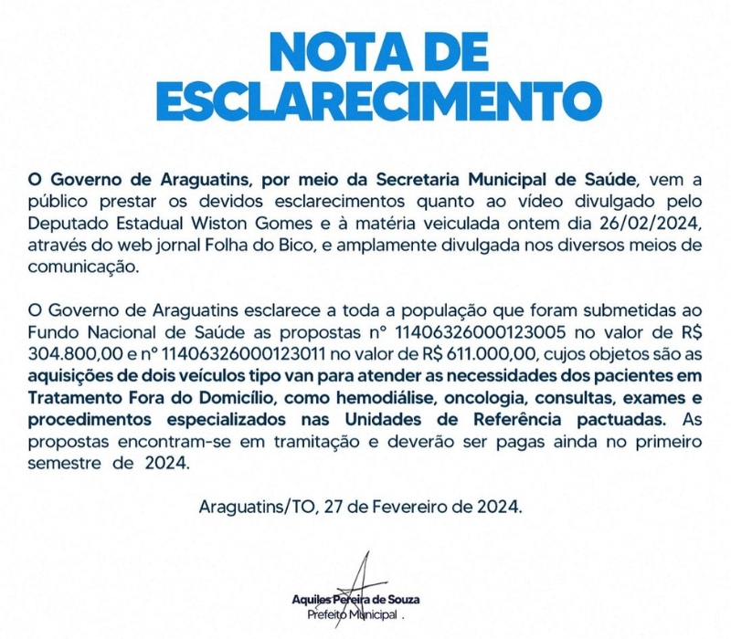 Após a veiculação de um vídeo pelo deputado estadual Wiston Gomes (PSD) e a posterior matéria publicada no jornal Folha do Bico, a Prefeitura de Araguatins, por meio da Secretaria Municipal de Saúde, divulgou uma nota comentando a situação, porém, não disse se vai aceitar ou não o recurso de R$ 200 mil, já destinado pelo parlamentar, e está à disposição da Secretaria.