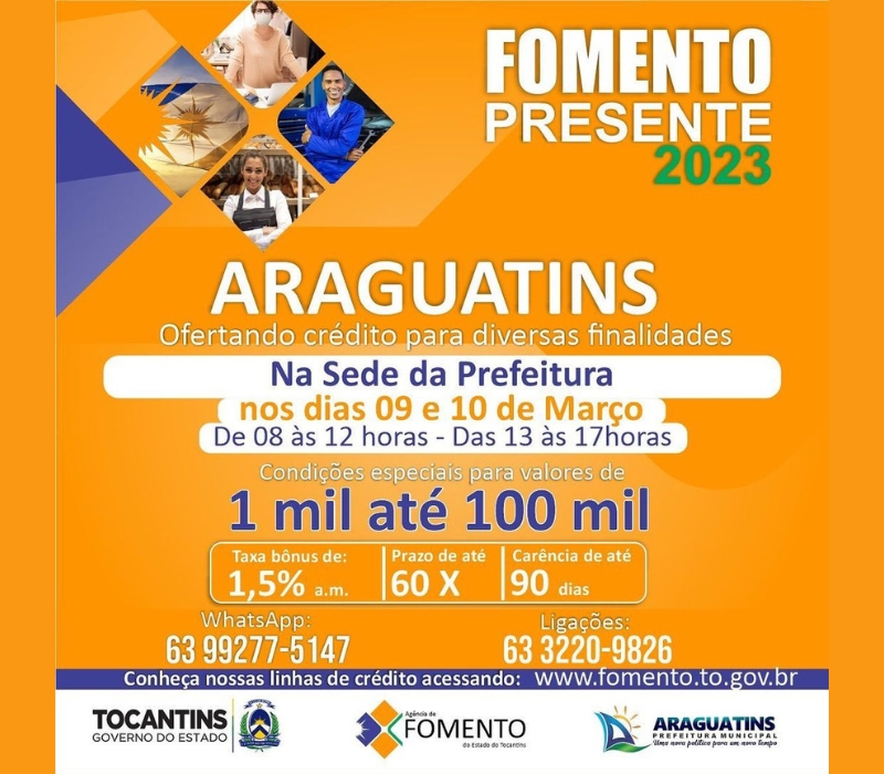 Por meio de uma parceria entre a Agência de Fomento do Governo do Tocantins e a Prefeitura de Araguatins, acontece essa semana, nos dias 9 e 10, uma ação do programa “Fomento Presente”, disponibilizando linhas de crédito para os mais diversos segmentos empresariais.