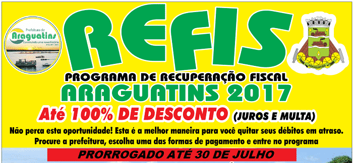 A Prefeitura de Araguatins prorrogou o Programa de Recuperação Fiscal Municipal (Refis), que é destinado a promover a regularização de créditos do Município relativos a Impostos como IPTU, Taxas, Contribuições de Melhoria e Tarifa de Água, ocorridos até 31 de dezembro de 2016. Agora o contribuinte tem até o dia 30 de julho de 2017 para aderir ao programa e garantir no pagamento á vista 100% de desconto nos juros e multa, ou ainda parcelar seus débitos em até 24 vezes.