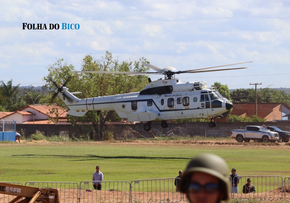 O presidente da República, Luiz Inácio Lula da Silva (PT), chegou ao município de Araguatins, no Bico do Papagaio, por volta das 10h40 desta sexta-feira, 27, em um helicóptero que pousou no gramado do estádio Mirandão. A aeronave partiu de Imperatriz (MA), após o avião presidencial aterrissar no aeroporto Renato Moreira. Lula foi recebido por uma comitiva de autoridades que incluiu o governador do Tocantins, Wanderlei Barbosa (Republicanos), o presidente da Assembleia Legislativa, deputado estadual Amélio Cayres (Republicanos), o prefeito de Araguatins, Aquiles da Areia (PP), deputados federais, senadores e lideranças locais.