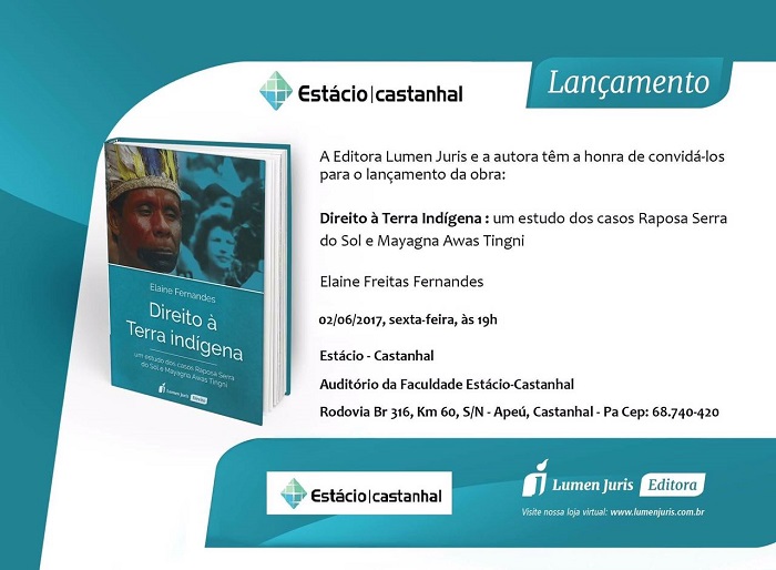 Mestra, professora e advogada, a araguatinense Elaine Freitas Fernandes, lança no próximo dia 2 de junho, no auditório da Faculdade Estácio, em Castanhal-PA, o livro Direito à Terra Indígena, que é um estudo dos casos da Raposa Serra do Sol e Mayagna Awas Tingni. O evento acontecerá as 19h.
