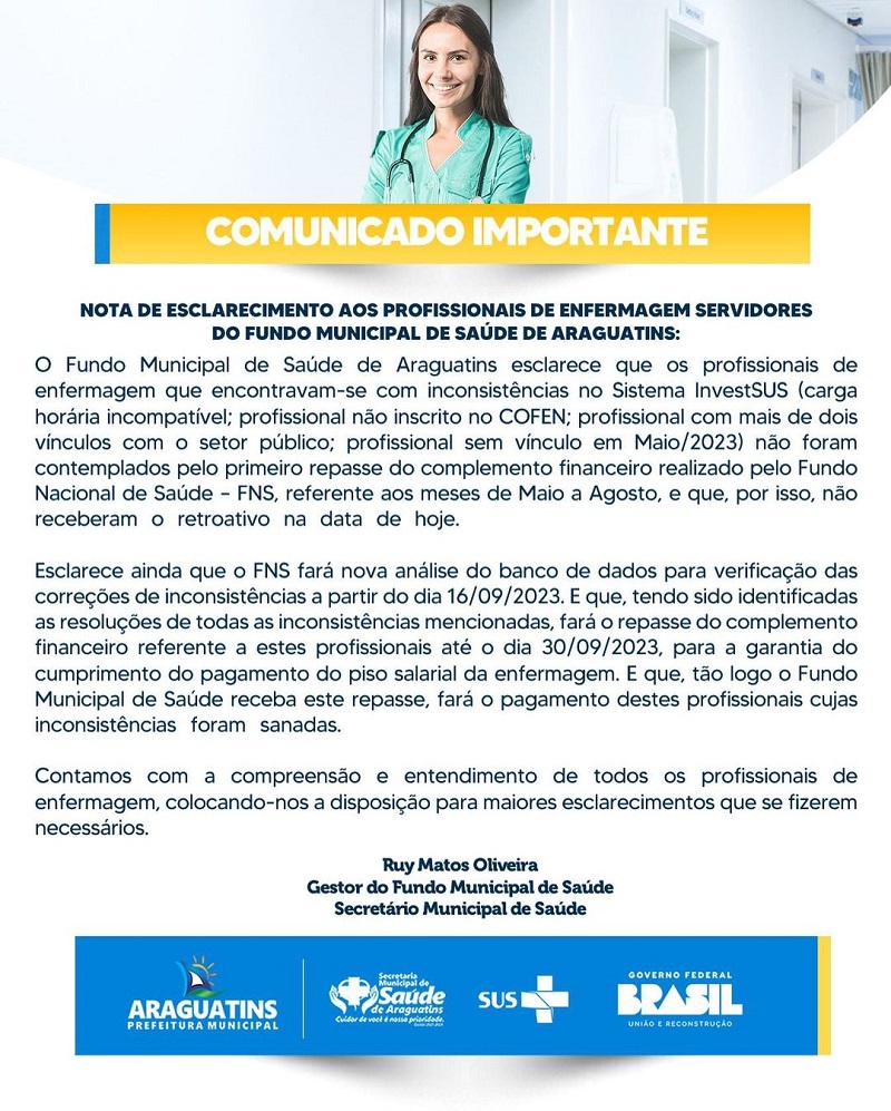 Fundo Municipal de Saúde de Araguatins esclarece que os profissionais de enfermagem que encontravam-se com inconsistências no Sistema InvestSUS (carga horária incompatível; profissional não inscrito no COFEN; profissional com mais de dois vínculos com o setor público; profissional sem vínculo em Maio/2023) não foram contemplados pelo primeiro repasse do complemento financeiro realizado pelo Fundo Nacional de Saúde – FNS, referente aos meses de Maio a Agosto, e que, por isso, não receberam o retroativo na data de hoje.