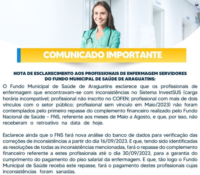 Fundo Municipal de Saúde de Araguatins esclarece que os profissionais de enfermagem que encontravam-se com inconsistências no Sistema InvestSUS (carga horária incompatível; profissional não inscrito no COFEN; profissional com mais de dois vínculos com o setor público; profissional sem vínculo em Maio/2023) não foram contemplados pelo primeiro repasse do complemento financeiro realizado pelo Fundo Nacional de Saúde – FNS, referente aos meses de Maio a Agosto, e que, por isso, não receberam o retroativo na data de hoje.