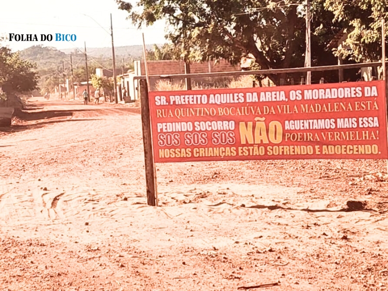 Na faixa, os moradores escreveram: “Senhor prefeito Aquiles da Areia, os moradores da rua Quintino Bocaiuva, da Vila Madalena, estão pedindo socorro, não aguentamos mais essa poeira vermelha! Nossas crianças estão sofrendo e adoecendo”.
