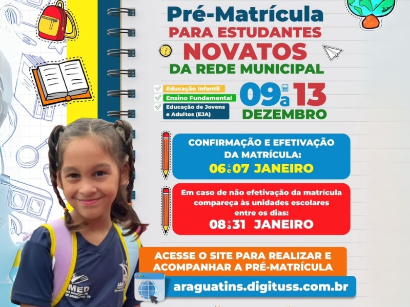 A Secretaria Municipal de Educação, anunciou o período de pré-matrículas para novos estudantes na rede municipal. O processo estará aberto de 9 a 13 de dezembro e é destinado a alunos que desejam ingressar nas escolas públicas do município.