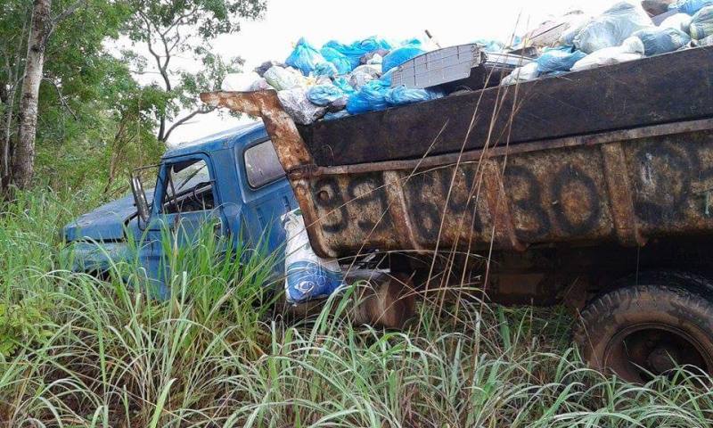 O caminhão se encontra em estado de péssima conservação de lataria, carroceria e parte mecânica e seguia carregado com destino ao lixão da cidade.