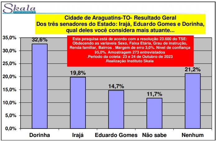 A última pesquisa do Instituto Skala em Araguatins, principal município do Bico do Papagaio, que mediu a avaliação popular e de gestão nas esferas municipal, estadual e federal, desta vez também perguntou aos moradores sobre a atuação dos três senadores da república, Eduardo Gomes (PL), Irajá Abreu (PSD) e Professora Dorinha.