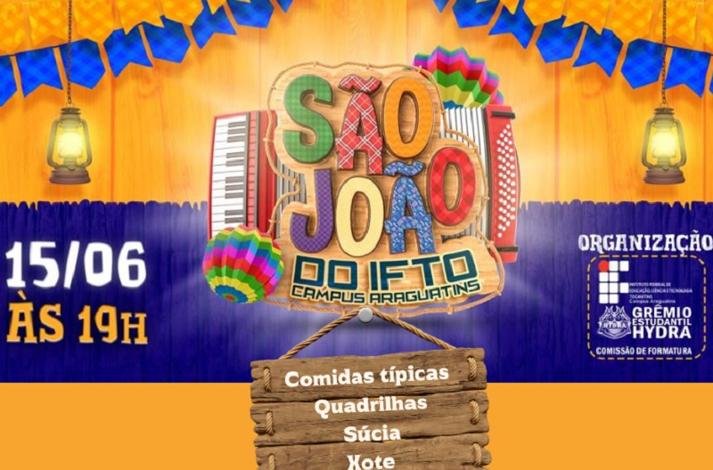 Uma festa animada com muita comida típica e apresentações de quadrilhas, xote e súcia. É o que promete o São João do IFTO, nesta quarta-feira, 15, véspera de feriado, na unidade de Araguatins do IFTO, a partir das 19h. A entrada é gratuita e a programação será aberta para toda a comunidade de Araguatins. O evento é promovido pelo IFTO e pelo grêmio estudantil Hydra.