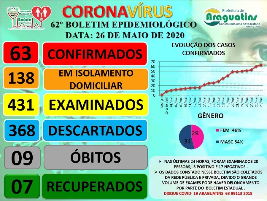 No geral, Araguatins já confirmou 63 pessoas que adquiriram a Covid-19. 138 pessoas estão em isolamento domiciliar.