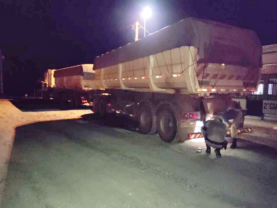 Durante mais um dia de fiscalização uma equipe de patrulheiros do BPMRED deu voz de parada a um conjunto de veículos de carga, composto por um caminhão trator que tracionava três semirreboques.
