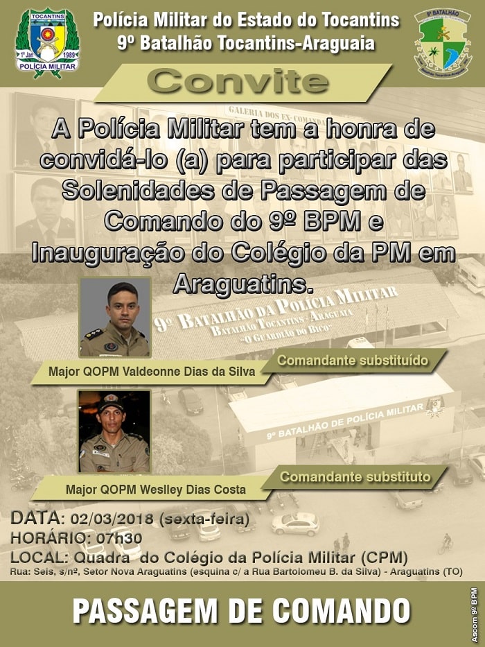 O 9º Batalhão da Polícia Militar (9 BPM), em Araguatins, passa a ter de forma oficial seu novos comandante a partir desta sexta-feira, 2. O major Weslley Dias Costas, assume a região no lugar do major Valdeonne Dias da Silva.