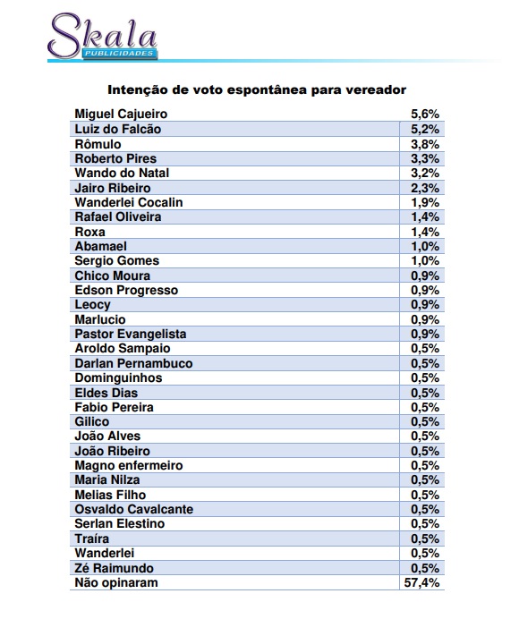 O Instituto Skala também mediu pelo método espontâneo a intenção de votos dos eleitores araguatinenses para o cargo de vereador, com vistas a eleição de 2024. O levantamento foi feito no dia 20 de maio de 2023 e ouviu 248 moradores. O grau de confiabilidade é de 95% e pode apresentar até 3,5% de margem de erro para mais ou para menos.