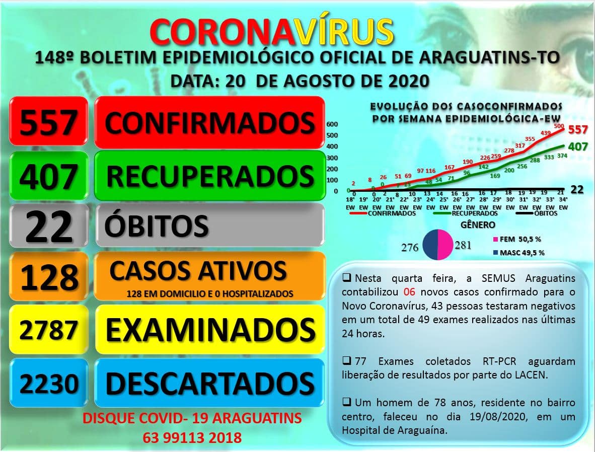 Publicidade Publicidade Bico do Papagaio ARAGUATINS: Veja os números da Covid-19 desta quinta, 20 By Folha do Bico 20 de agosto de 2020 0 700 Share WhatsAppPrintTelegramFacebookTwitterCopy URL Folha do Bico Noticias Relacionadas SÃO MIGUEL: Suspeito de 50 anos é detido por manter arma de fogo sem autorização 23 de janeiro de 2026 ARAGUATINS: Homem é capturado por receptação e adulteração de veículo 23 de janeiro de 2026 AUGUSTINÓPOLIS: Mais de 7,5 toneladas de sementes serão distribuídas para fortalecer a agricultura familiar 23 de janeiro de 2026 Share WhatsAppPrintTelegramFacebookTwitterCopy URL Previous article5,6% dos tocantinenses realizaram testes para Covid-19 até julho e 2,2% não adotaram o isolamentoNext articleMARABÁ: Helder assina ordem de serviço e autoriza ampliação de obras de pavimentação - Advertisement - - Advertisement - Ultimas noticias Superclássico do Bico: Tocantinópolis impõe ritmo e vence o Bela Vista por 2 a 0 24 de janeiro de 2026 Palmas FR sofre novo revés e União AC consolida bom início no Tocantinense 24 de janeiro de 2026 Justiça condena Evoney Fernandes, Fábio Netto e Hitalon Bastos por rifas ilegais na internet 23 de janeiro de 2026 TOCANTINÓPOLIS: Valores de taxa viária estão bloqueados pela Justiça 23 de janeiro de 2026