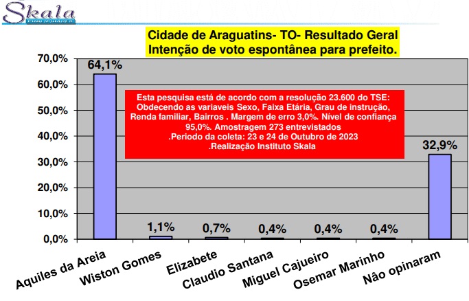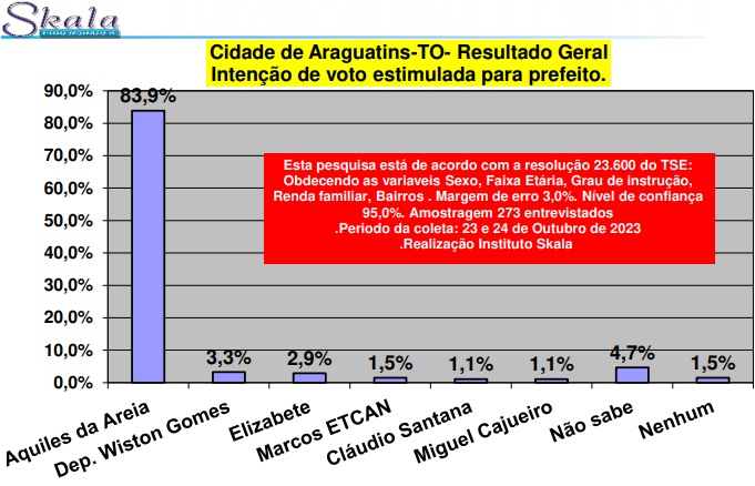 Uma nova pesquisa realizada pelo Instituto Skala no município de Araguatins, no Bico do Papagaio, trouxe dados sobre as preferências dos eleitores para a disputa pela Prefeitura Municipal.