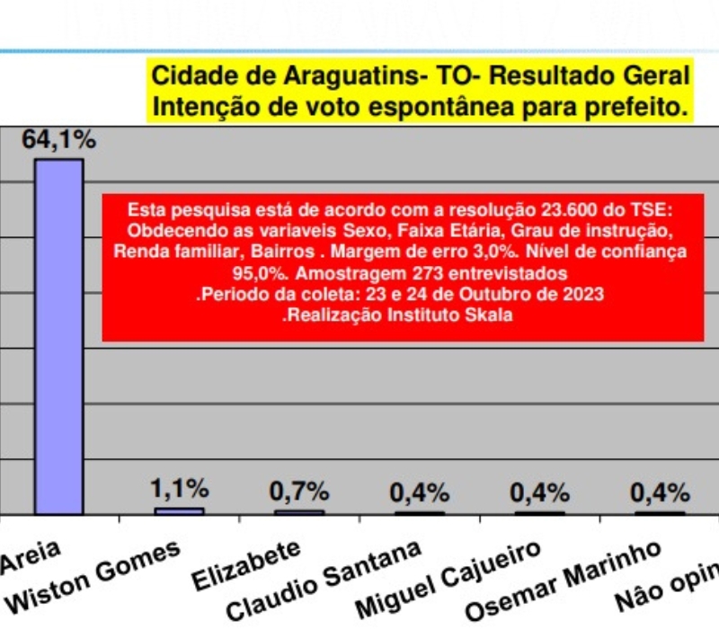 Uma nova pesquisa realizada pelo Instituto Skala no município de Araguatins, no Bico do Papagaio, trouxe dados sobre as preferências dos eleitores para a disputa pela Prefeitura Municipal.