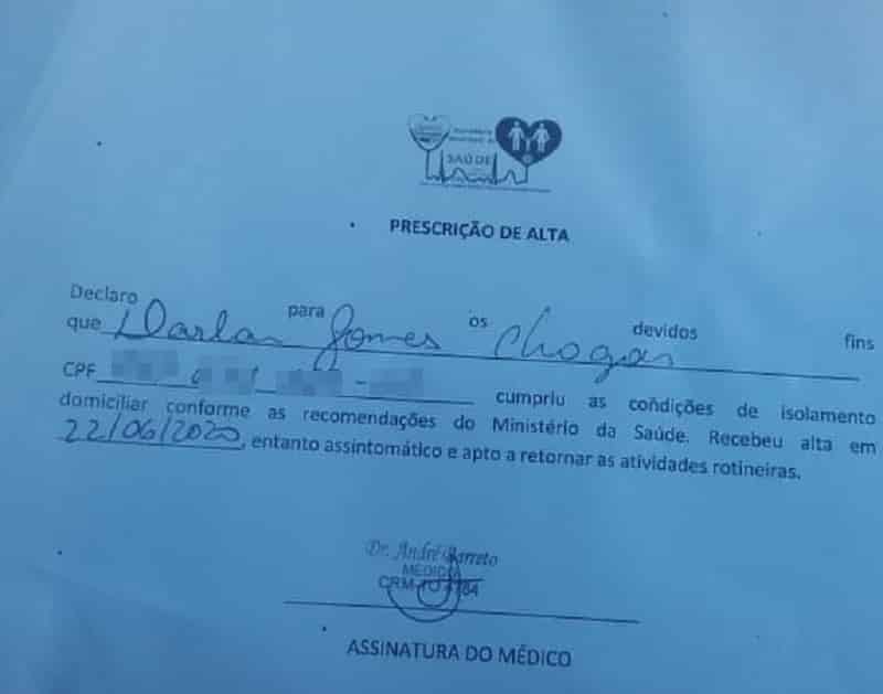 A informações foi divulgada pela assessoria da Câmara Municipal que mostrou a Prescrição de Alta do parlamentar.