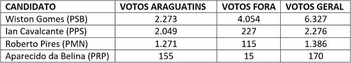 Wiston além ser o mais votado entre os eleitores araguatinenses, foi também o mais votado no geral, comparado com seus conterrâneos. Wiston obteve 2.273 votos em Araguatins. No geral, ele conseguiu 6.327 votos.