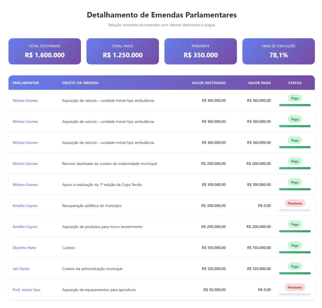 Na sequência do ranking aparece o presidente da Assembleia Legislativa, deputado Amélio Cayres (Republicanos), com R$ 500 mil em emendas destinadas ao município. Desse total, R$ 200 mil já foram pagos, enquanto R$ 300 mil seguem pendentes de execução. Com valores menores, completam a lista Olyntho Neto, com R$ 150 mil; Jair Farias, com R$ 120 mil; e o professor Júnior Geo, com R$ 50 mil, todos com destinações registradas no exercício de 2025.