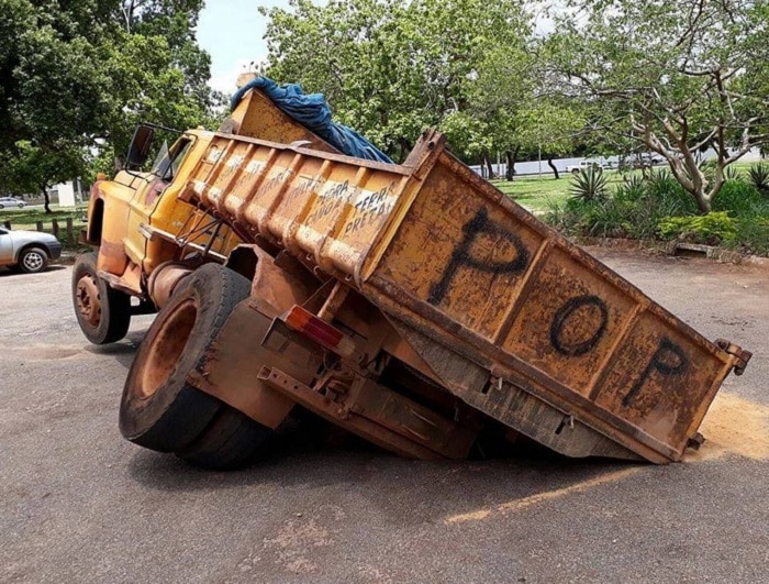 O asfalto do retorno de uma rua da quadra 308 Sul, na região central de Palmas, cedeu e engoliu parte de um caminhão na tarde desta segunda-feira (4). Um registro feito do local viralizou na web e os internautas brincaram sobre a qualidade da malha asfáltica na cidade.