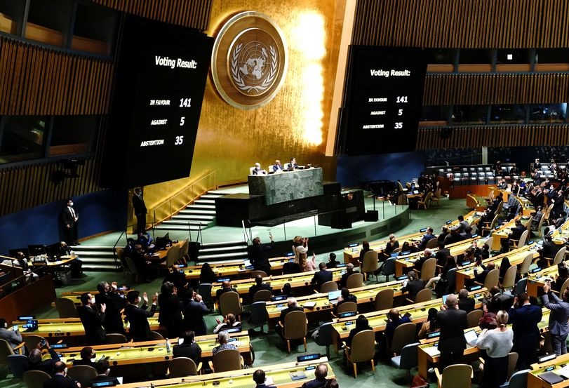 Em sessão extraordinária da Assembleia Geral das Nações Unidas sobre a Ucrânia nesta quarta, 2, 141 países votaram a favor da resolução que condena a invasão russa, cinco nações votaram contra e 35 se abstiveram. A resolução, que não tem poder legal, pede que a Rússia retire suas tropas. Apesar de não ser uma medida concreta, a decisão tem um poder político muito grande e evidencia o isolamento russo. O Brasil votou a favor. A China se absteve.