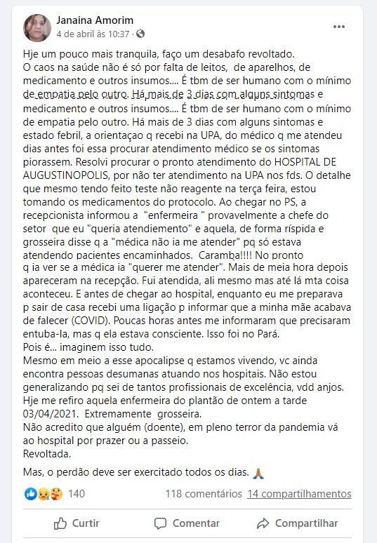 A professora, Janaína Amorim Soares, foi mais uma vítima da Covid-19, no Bico do Papagaio. Ela morreu no sábado, dia 17, no Hospital da Unimed, em Imperatriz, na região sul do Maranhão. Antes disso, no dia 4, já se sentindo mal, por conta da doença e buscado atendimento médico, relatou nas redes sociais, o descaso de alguns profissionais que lhe atenderam.