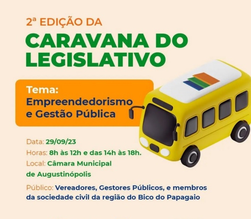 A Assembleia Legislativa do Tocantins (ALETO) realiza nesta sexta-feira, 29, a 2ª Edição Caravana do Legislativo, em Augustinópolis, no Bico do Papagaio. O tema do evento será “Empreendedorismo e Gestão Pública”.