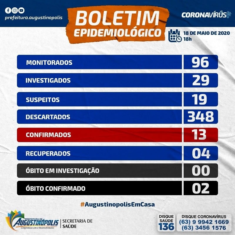 Publicidade Publicidade Bico do Papagaio AUGUSTINÓPOLIS: 3 novos casos de coronavírus são confirmados By Folha do Bico 18 de maio de 2020 0 1145 Share WhatsAppPrintTelegramFacebookTwitterCopy URL Folha do Bico Noticias Relacionadas Contabilistas do Bico do Papagaio alinham ações para encerramento do ano 16 de dezembro de 2025 SAMPAIO: Acordo garante pagamento de anuênios e avanço no plano de carreira da educação 16 de dezembro de 2025 ARAGUATINS: Moto roubada é localizada em área de matagal após diligências 16 de dezembro de 2025 Subiu de 10 para 13 o número de pessoas que contraíram coronavírus (Covid-19), no município de Augustinópolis, no Bico do Papagaio, nesta segunda, 18. A boa notícia é que mais um caso curado foi anunciado, chegando a 4 no total. Share WhatsAppPrintTelegramFacebookTwitterCopy URL Previous articleÚltima fase da campanha de vacinação contra Influenza começou nesta segunda, 18Next articleIMPERATRIZ: Prefeitura orienta comércio no primeiro dia de flexibilização - Advertisement - - Advertisement - Ultimas noticias ARAGUATINS: Homem é preso após subtrair celular e tentar reagir a abordagem 17 de dezembro de 2025 Governadores do Tocantins e Maranhão participarão de inauguração da nova Ponte JK 17 de dezembro de 2025 Inauguração da nova Ponte JK é marcada para dia 22. Lula não confirma presença 16 de dezembro de 2025 PARAUAPEBAS: Mais de 55 mil contribuintes são notificados por débitos de IPTU 16 de dezembro de 2025