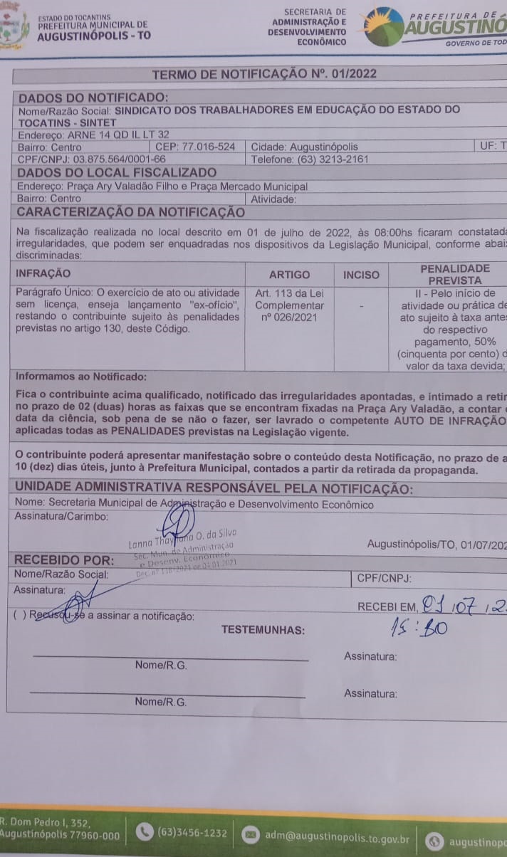 Segundo o Sindicato dos Trabalhadores em Educação no Estado do Tocantins (Sintet), o prefeito de Augustinópolis, Antônio do Bar (PSC), mandou notificar o no dia 1º de julho, a entidade, por estender faixas nas praças públicas da cidade. As faixas contêm frases cobrando o pagamento do reajuste do piso do magistério que conforme o Sindicato, o prefeito não pagou na sua totalidade.