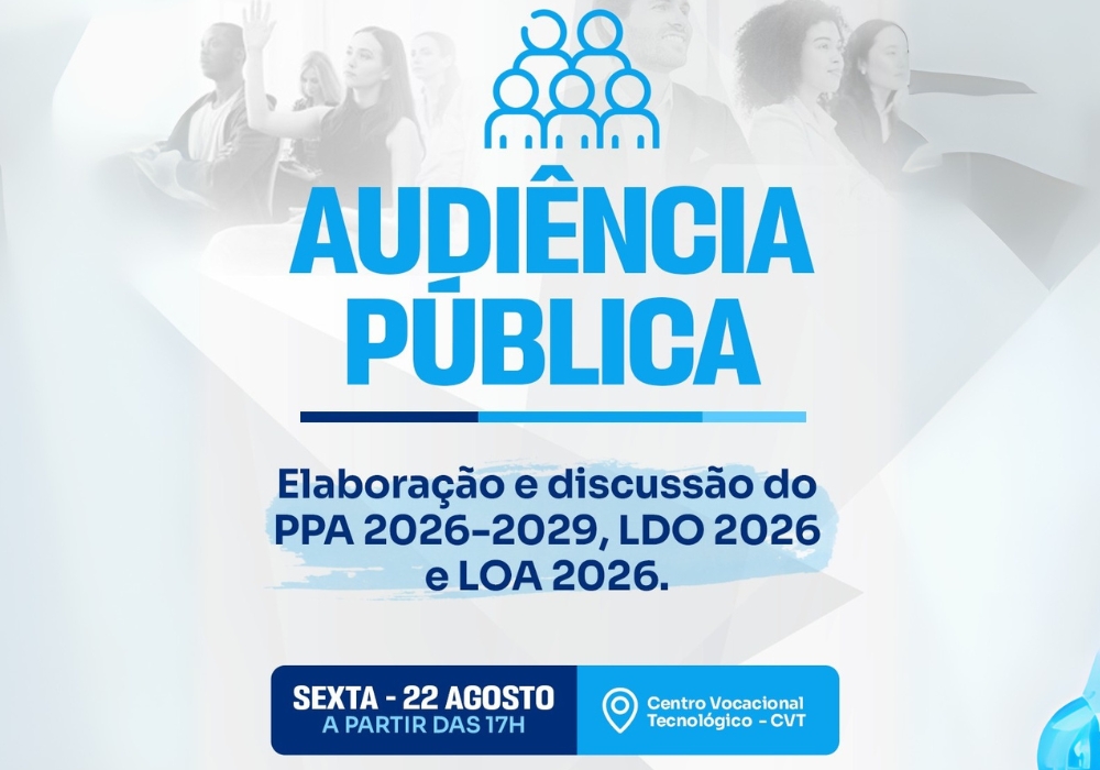 A Prefeitura de Augustinópolis convida autoridades, lideranças comunitárias, representantes de associações e toda a população para participar da Audiência Pública de elaboração e discussão do Plano Plurianual (PPA 2026-2029), da Lei de Diretrizes Orçamentárias (LDO 2026) e da Lei Orçamentária Anual (LOA 2026).