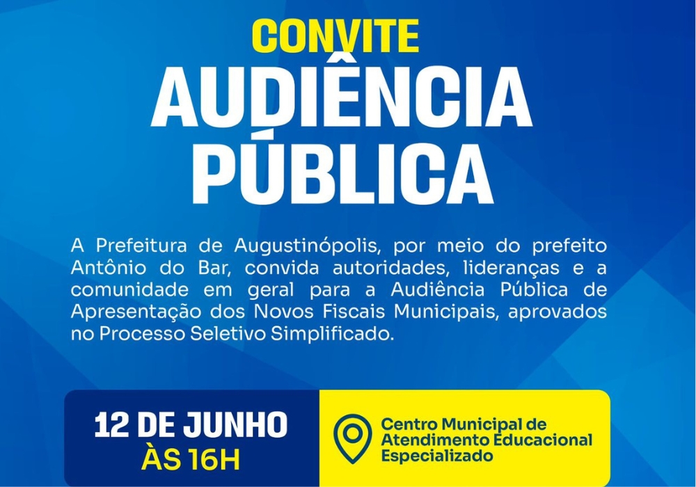 A Prefeitura de Augustinópolis realiza nesta quinta-feira, 12, uma audiência pública para discutir e apresentar à população a atuação dos novos fiscais de Obras, Postura e Meio Ambiente. O evento acontece a partir das 16h, no Centro Municipal de Atendimento Educacional Especial Raimundo Pereira de Sousa.
