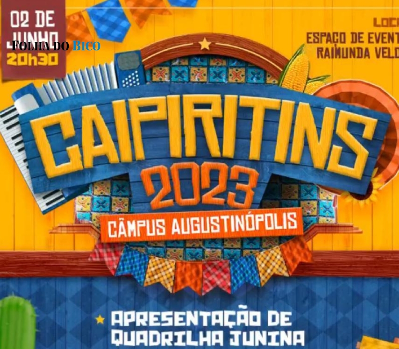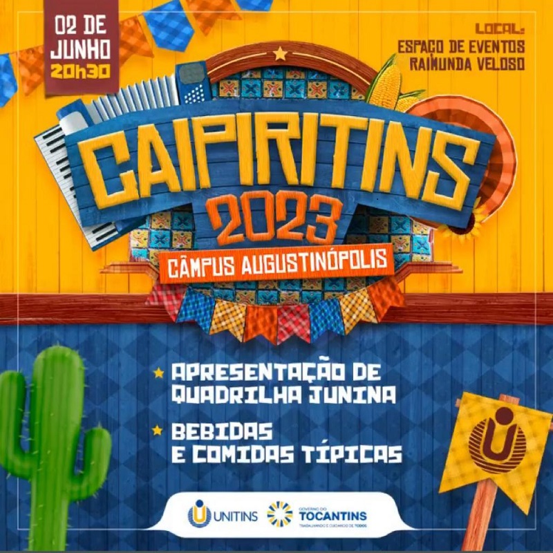 O Caipiritins do Câmpus Augustinópolis da Universidade Estadual do Tocantins (Unitins) abre a temporada de festas juninas na cidade nesta sexta-feira, 2, no Espaço Raimunda Veloso, a partir das 20h30. A entrada é gratuita. A festa tradicional é organizada pelas atléticas estudantis da Instituição em conjunto com a direção do Câmpus.