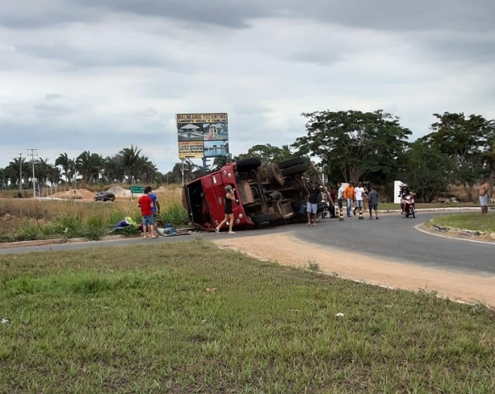 Um caminhão tombou no começo da tarde deste domingo, 20, na rotatória de convergências da Avenida Goiás com rodovias TO’s 201 e 404, na cidade de Augustinópolis, no Bico do Papagaio.